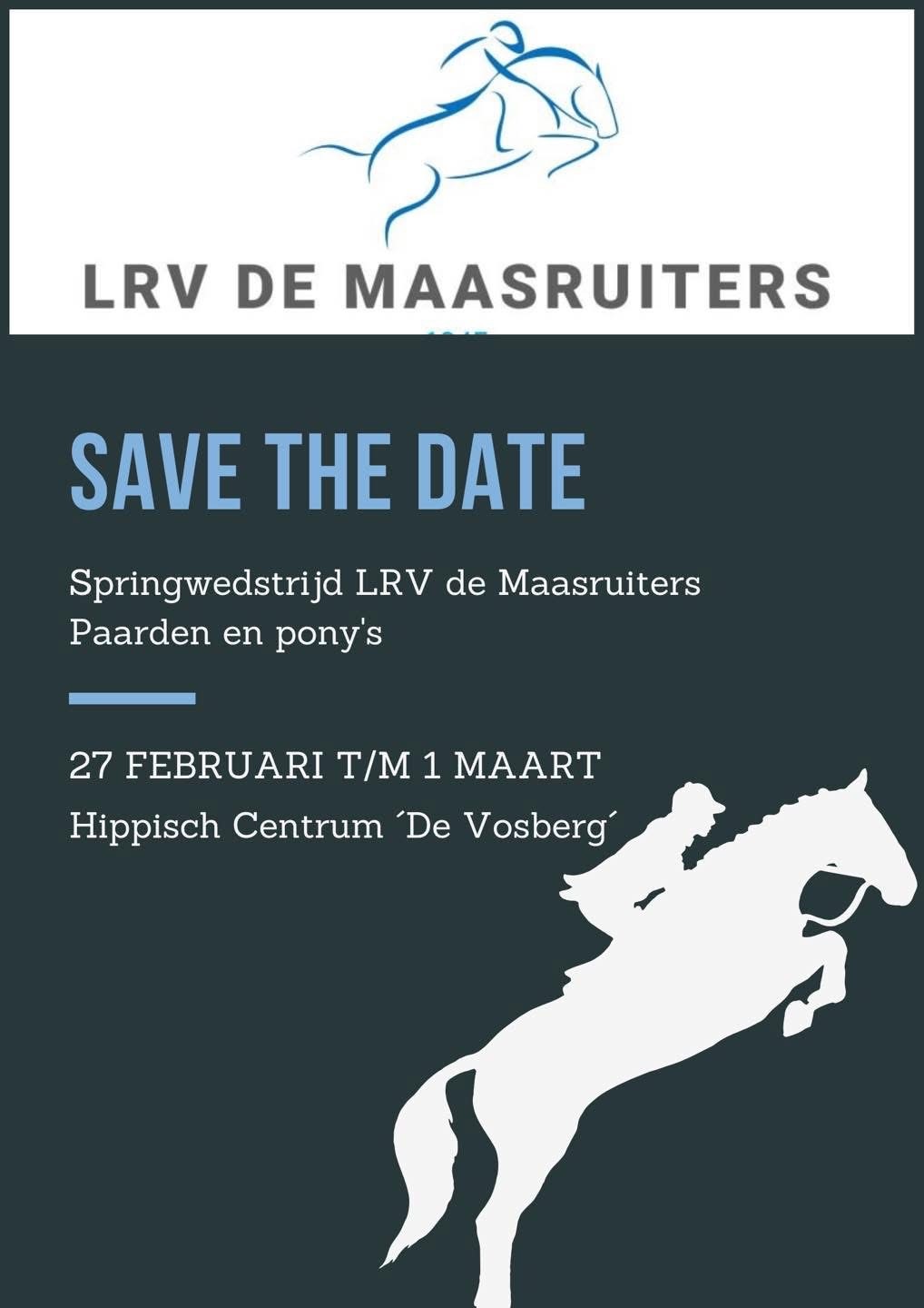 Springwedstrijd LRV De Maasruiters | Paarden en Pony's Hippisch Centrum 'De Vosberg' Vrijdag oefenwedstrijd paarden -70/80 - 95 - 105 - 115 - 125 - 135 Zaterdag KNHS paarden - 120 -130 -135 en 80/90 - 100 -110 Zondag pony's alle rubrieken KNHS -beginnend met 30 cm voor Winstpunten - 40 t/m 120cm |